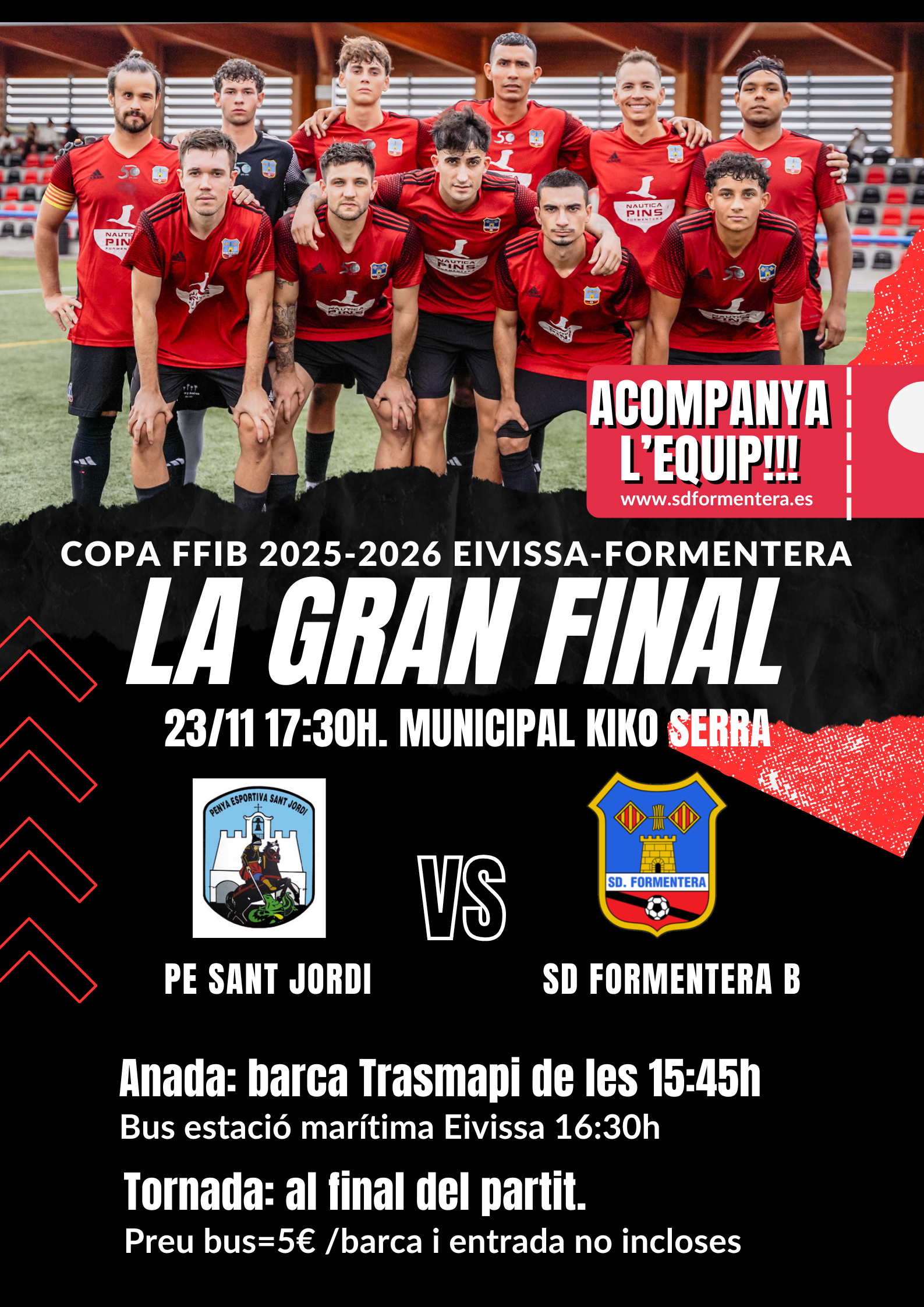El club organitza un autocar amb sortida Estació marítima d’Eivissa aproximadament a les 16:30h (a l’arribada de la barca Trasmapi de les 15:45h) i amb tornada després de la final.